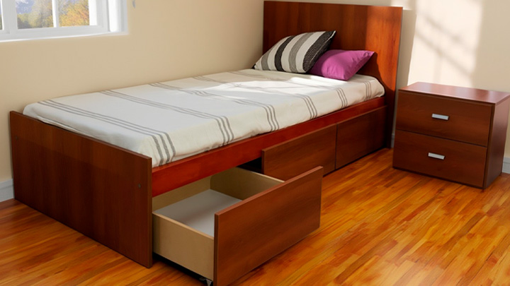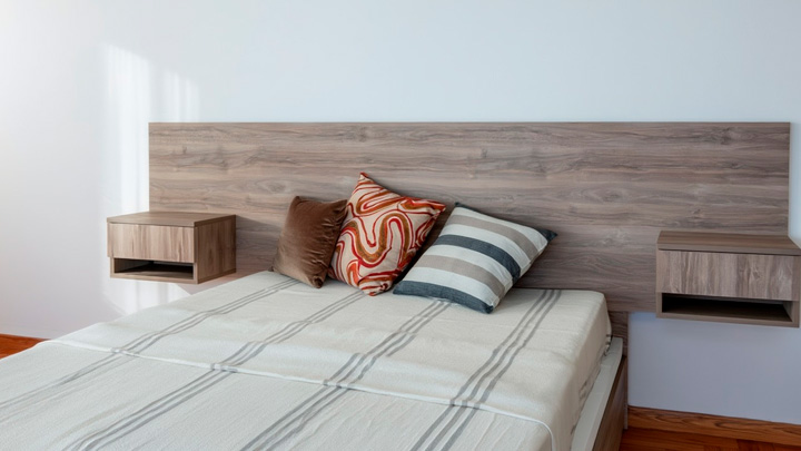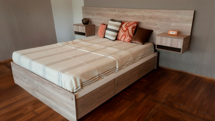 Cama base + 6 cajones de 60 x 60 + respaldo con 2 mesas de luz flotantes